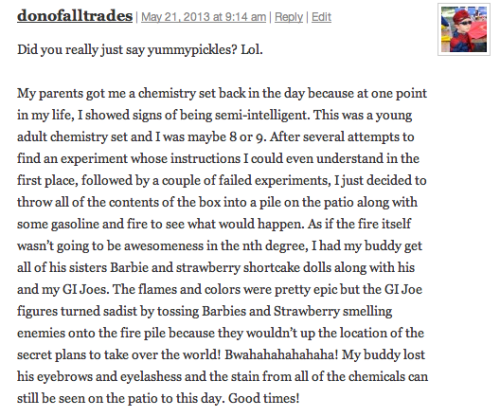 The lovely and talented Renee Something or other with an a and then a name and a hyphen and another name too had a contest seeking comments about naughty childhood deeds. You should go read some of them, they’re funny. Here’s mine. I picked a clean one even!