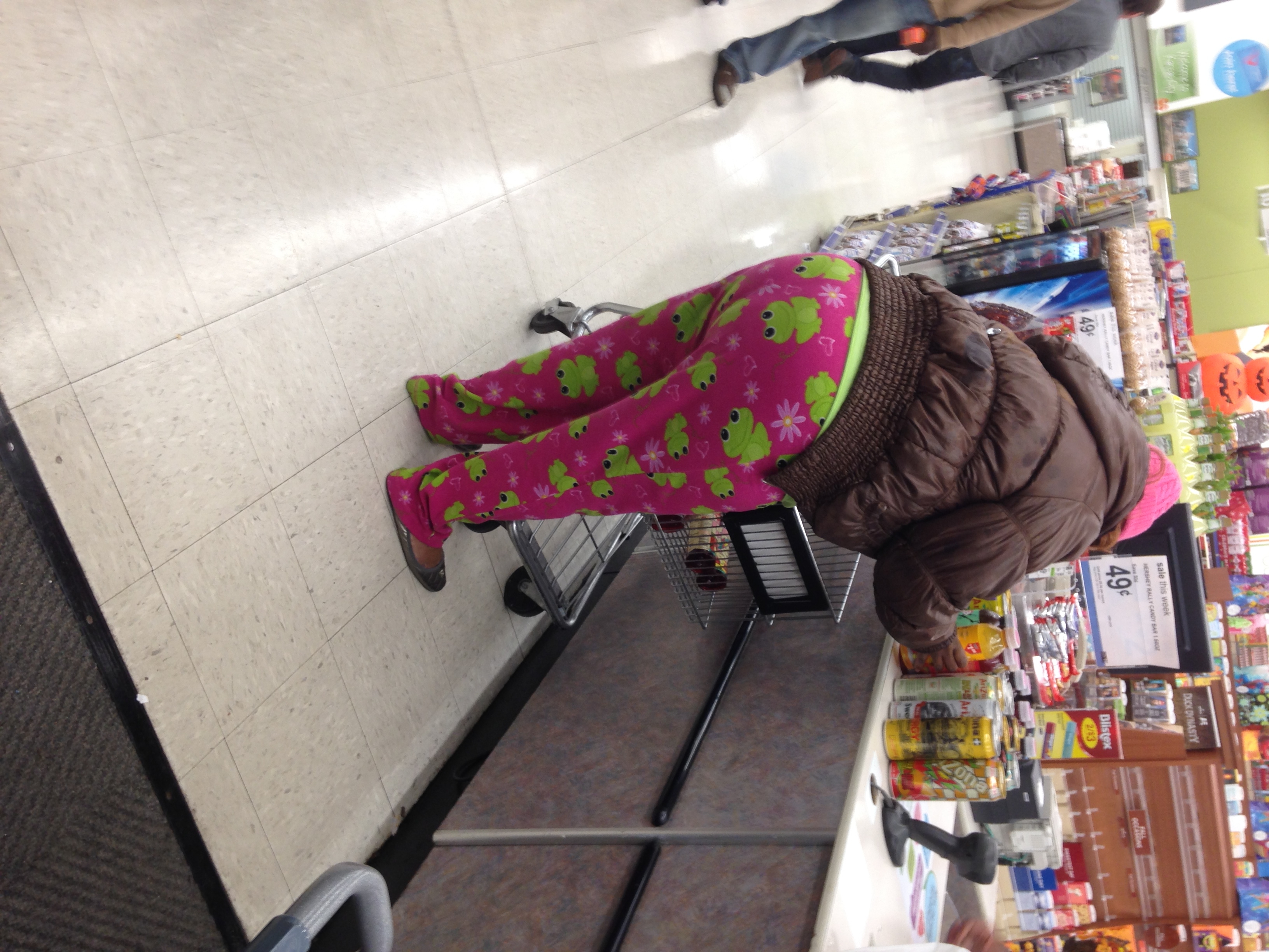Princess froggy drawers here was buying a shit-ton of energy drinks and flavored teas which I hope will give her the energy she needs to put on some fucking real pants next time she leaves the house.